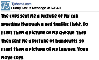 X says The cops sent me a picture of my car speeding through a red traffic light. So I sent them a picture of my cheque. They then sent me a picture of handcuffs, so I sent them a picture of my lawyer. Your move cops.