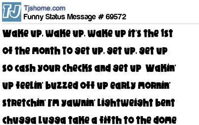 X is Wake up, wake up, wake up it's the 1st of the month To get up, get up, get up so cash your checks and get up Wakin' up feelin' buzzed off up early mornin' stretchin' I'm yawnin' lightweight bent chugga lugga take a fifth to the dome Instead I kick it wit
