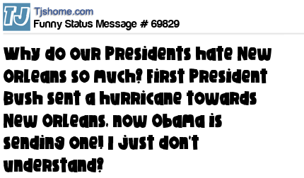X Why do our Presidents hate New Orleans so much? First President Bush sent a hurricane towards New Orleans, now Obama is sending one! I just don't understand?