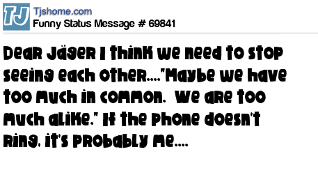 X  Dear Jäger I think we need to stop seeing each other...."Maybe we have too much in common.  We are too much alike." If the phone doesn't ring, it's probably me....