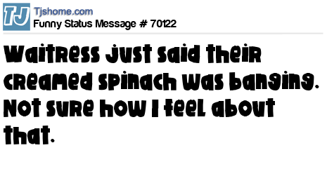 - # 17175 asked the waitress what she recommended and she said the spinach dip was bangin'. Not quite sure how I feel 'bout that.