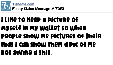 X I like to keep a picture of myself in my wallet so when people show me pictures of their kids I can show them a pic of me not giving a sh!t.