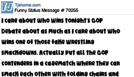 X I care about who wins tonight's GOP Debate about as much as I care about who wins one of those fake wrestling smackdowns. Actually put all the GOP contenders in a cagematch where they can smack each other with folding chairs and I might actually watch it.