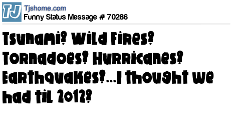 - # 70263 Me: Tornadoes? Hurricanes? Earthquakes?...I thought we had til 2012? Mayans: Sorry about that...forgot to carry the 1.