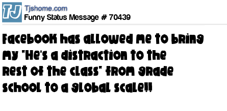 - # 28024 Facebook has allowed me to bring my "He's a distraction to the rest of the class" from grade school to a global scale.