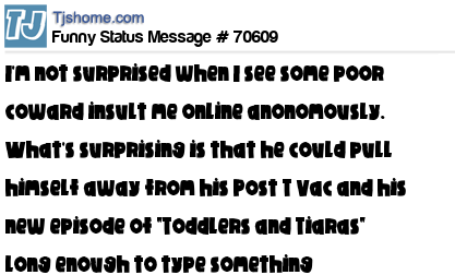 X I'm not surprised when I see some poor coward insult me online anonomously. What's surprising is that he could pull himself away from his Post T Vac and his new episode of "Toddlers and Tiaras" long enough to type something intelligible.