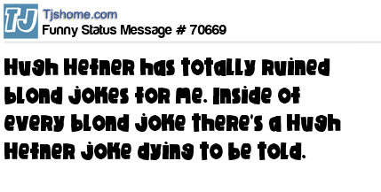 X Hugh Hefner has totally ruined blond jokes for me. Inside of every blond joke there's a Hugh Hefner joke dying to be told.