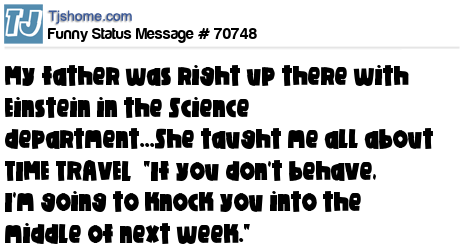 X My father was right up there with Einstein in the Science department...She taught me all about TIME TRAVEL "If you don't behave, I'm going to knock you into the middle of next week."