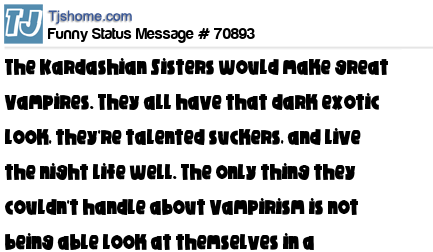 X The Kardashian Sisters would make great Vampires. They all have that dark exotic look, they're talented suckers, and live the night life well. The only thing they couldn't handle about Vampirism is not being able look at themselves in a mirror any more.