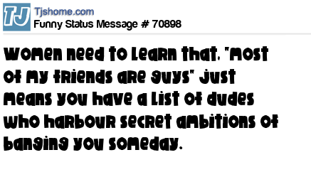 - # 67681 Women need to learn that "most of my friends are guys" just means you have a list of dudes who are trying to bone you.