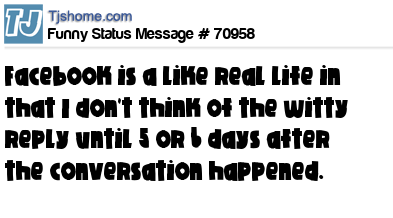 X is Facebook is a like real life in that I don't think of the witty reply until 5 or 6 days after the conversation happened.