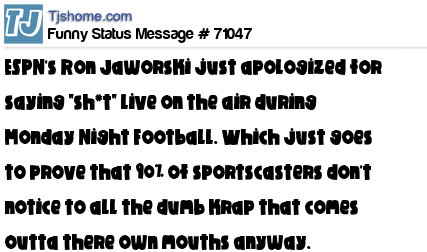 X is ESPN's Ron Jaworski just apologized for saying "sh*t" live on the air during Monday Night Football. Which just goes to prove that 90% of sportscasters don't notice to all the dumb krap that comes outta there own mouths anyway.
