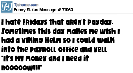 X I hate Fridays that aren't payday. Sometimes this day makes me wish I had a Viking Helm so I could walk into the payroll office and yell "It's MY money and I need it nooooow!!!"