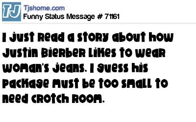 X says I just read a story about how Justin Bierber likes to wear woman's jeans. I guess his package must be too small to need crotch room.