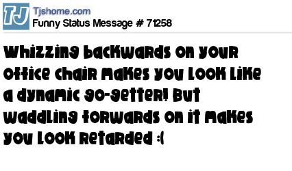 X Whizzing backwards on your office chair makes you look like a dynamic go-getter! But waddling forwards on it makes you look retarded :(