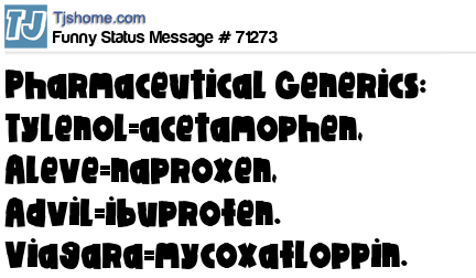 X Pharmaceutical Generics: Tylenol=acetamophen, Aleve=naproxen, Advil=ibuprofen. Viagara=mycoxafloppin.