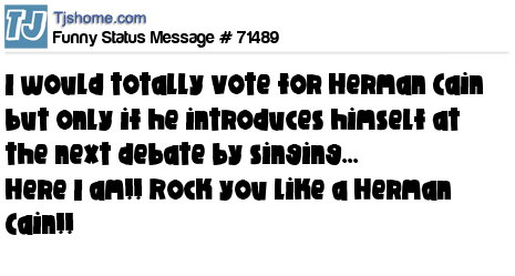 - # 75924 I would totally vote for Herman Cain but only if he introduces himself at the next debate by singing, "Here I am!! Rock you like a Herman Cain!! "