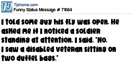 X I told some guy his fly was open. He asked me if I noticed a soldier standing at attention. I said. "No, I saw a disabled veteran sitting on two duffel bags."