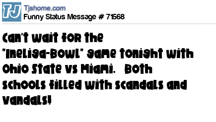 X is Can't wait for the "Ineliga-Bowl" game tonight with Ohio State vs Miami. Both schools filled with scandals and vandals!