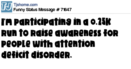 X I'm participating in a 0.25K run to raise awareness for people with attention deficit disorder.