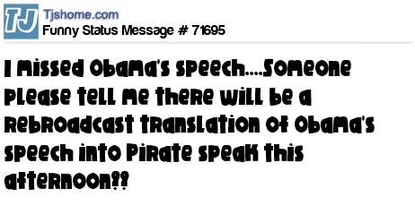 X  I missed Obama's speech....Someone please tell me there will be a rebroadcast translation of Obama's speech into Pirate speak this afternoon??