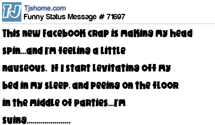 X is This new Facebook crap is making my head spin...and I'm feeling a little nauseous. If I start levitating off my bed in my sleep, and peeing on the floor in the middle of parties...I'm suing......................