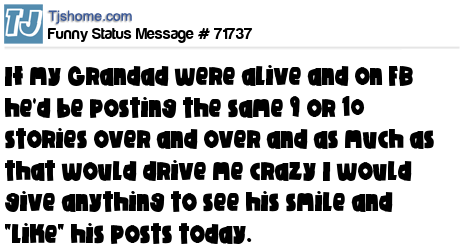 X If my Grandad were alive and on FB he'd be posting the same 9 or 10 stories over and over and as much as that would drive me crazy I would give anything to see his smile and "like" his posts today.