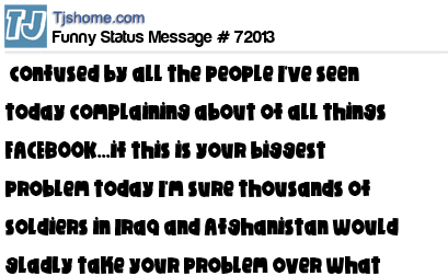 X says confused by all the people I've seen today complaining about of all things FACEBOOK...if this is your biggest problem today I'm sure thousands of soldiers in Iraq and Afghanistan would gladly take your problem over what they're dealing with.