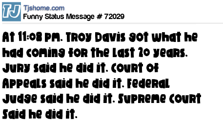X is at 11:08 pm. Troy Davis got what he had coming for the last 20 years. Jury said he did it. Court of Appeals said he did it. Federal Judge said he did it. Supreme Court Said he did it.