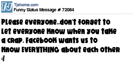 X is Please everyone..don't forget to let everyone know when you take a crap. Facebook wants us to know EVERYTHING about each other :/