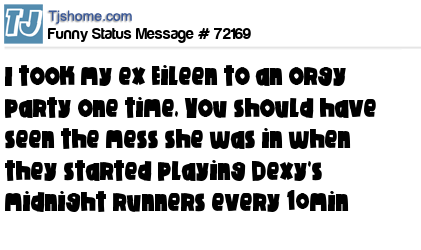 X is I took my ex Eileen to an orgy party one time, You should have seen the mess she was in when they started playing Dexy's midnight runners every 10min