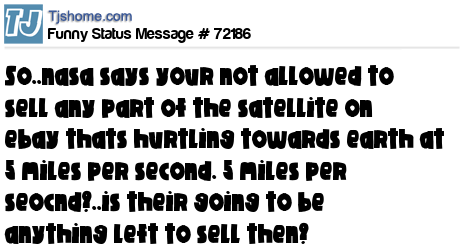 X is so..nasa says your not allowed to sell any part of the satellite on ebay thats hurtling towards earth at 5 miles per second. 5 miles per seocnd?..is their going to be anything left to sell then?