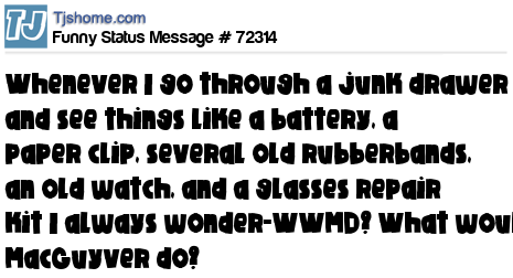 X Whenever I go through a junk drawer and see things like a battery, a paper clip, several old rubberbands, an old watch, and a glasses repair kit I always wonder-WWMD? What would MacGuyver do?