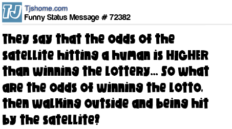 - # 72195 So you saying I have a better chance in getting hit by a piece satellite then winning the lotto tomorrow!?!? WTF!!