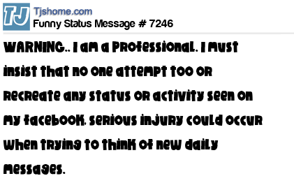 X  WARNING.. I am a Professional. I must insist that no one attempt too or recreate any status or activity seen on my facebook, serious injury could occur when trying to think of new daily messages.