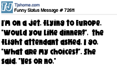 X I'm on a jet, flying to Europe. "Would you like dinner?", the flight attendant asked. I go, "What are my choices?". She said, "Yes or no."