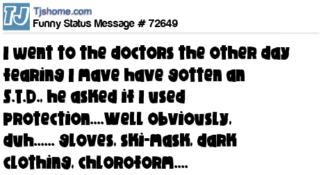 X is I went to the doctors the other day fearing I mave have gotten an S.T.D., he asked if I used protection....Well obviously, duh...... gloves, ski-mask, dark clothing, chloroform....