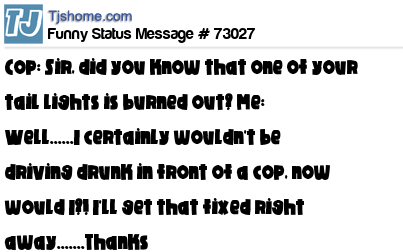 X Cop: Sir, did you know that one of your tail lights is burned out? Me: Well......I certainly wouldn't be driving drunk in front of a cop, now would I?! I'll get that fixed right away.......Thanks
