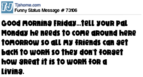 X is Good morning Friday...tell your pal Monday he needs to come around here tomorrow so all my friends can get back to work so they don't forget how great it is to work for a living.
