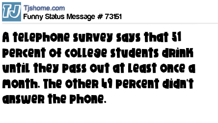 X is A telephone survey says that 51 percent of college students drink until they pass out at least once a month. The other 49 percent didn't answer the phone.