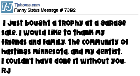 X is I just bought a trophy at a garage sale. I would like to thank my friends and family, the community of hastings minnesota, and my dentist. I couldn't have done it without you. RJ