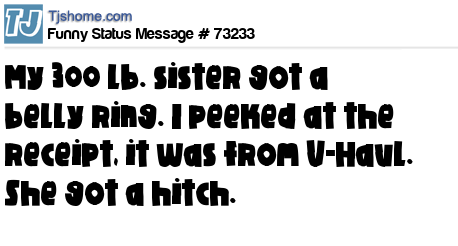 X  My 300 lb. sister got a belly ring. I peeked at the receipt, it was from U-Haul. She got a hitch.