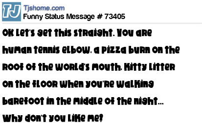 X is OK let's get this straight. You are human tennis elbow, a pizza burn on the roof of the world's mouth, kitty litter on the floor when you're walking barefoot in the middle of the night... Why don't you like me?