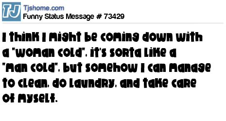 X  I think I might be coming down with a "woman cold", it's sorta like a "man cold", but somehow I can manage to clean, do laundry, and take care of myself.
