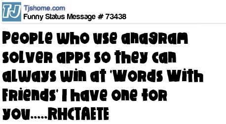 - # 96547 I think people who challenge me at WORDS WITH FRIENDS are most impressed with my vast knowledge of three letter words.