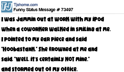 X I was jammin out at work with my iPod when a coworker walked in smiling at me. I pointed to my ear piece and said "Hoobastank." She frowned at me and said, "Well, it's certainly NOT mine." and stormed out of my office.