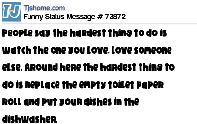 X People say the hardest thing to do is watch the one you love, love someone else. Around here the hardest thing to do is replace the empty toilet paper roll and put your dishes in the dishwasher.