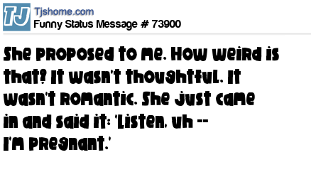 X says She proposed to me. How weird is that? It wasn't thoughtful. It wasn't romantic. She just came in and said it: 'Listen, uh -- I'm pregnant.'