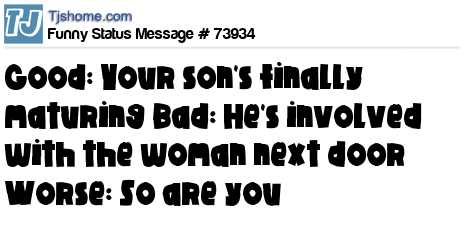 X Good: Your son's finally maturing Bad: He's involved with the woman next door Worse: So are you