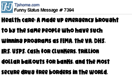 X Health care: A made up emergency brought to by the same people who have such winning programs as FEMA, the VA, DHS, IRS, USPS, Cash for Clunkers, trillion dollar bailouts for banks, and the most secure drug free borders in the world.